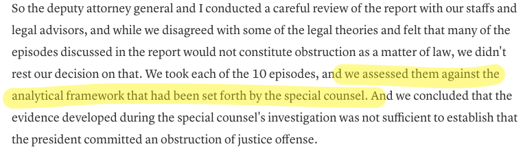 Barr makes this clear today: he didnt simply misinterpret Mueller, he overruled him- WE DIDNT AGREE WITH THE LEGAL ANALYSIS..IT DID NOT REFLECT THE VIEWS OF THE DEPARTMENT. IT WAS THE VIEWS OF PARTICULAR LAWYER OR LAWYERS, AND SO WE APPLIED WHAT WE THOUGHT WAS THE RIGHT LAW.