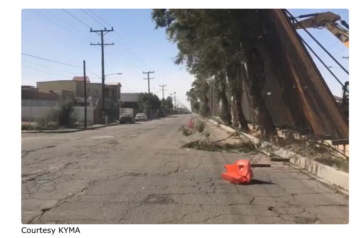 KYMA published footage showing the panels teetering on trees in Mexicali on the Mexico side amid wind gusts, with the TV station reporting that police in Mexicali confirmed the 130-foot segment fell a little before 12 p.m. local time.