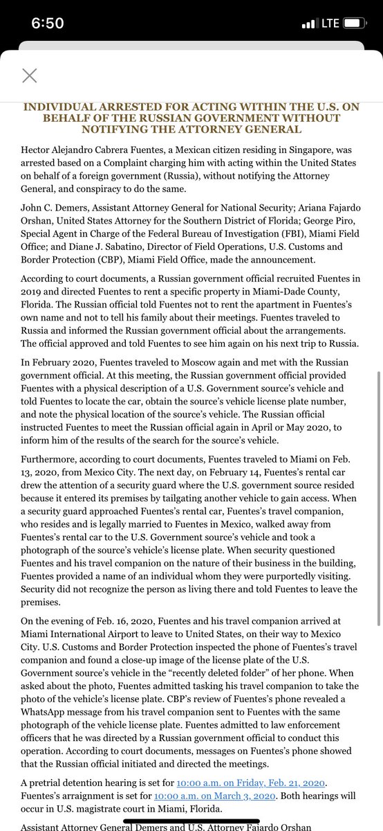 Um holy cow. A Mexican citizen was allegedly tracking a US government source in the US on behalf of a Russian official, and has been arrested for it. The Russian government official ... told Fuentes to note the physical location of the sources vehicle. h/t @joshgerstein