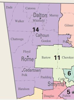 Georgia's 14th Congressional District includes almost all of northwestern Georgia. Catoosa, Chattooga, Dade, Floyd, Gordon, Haralson, Murray, Paulding, Polk, Walker, Whitfield, and a portion of Pickens counties are included in the district.[3]