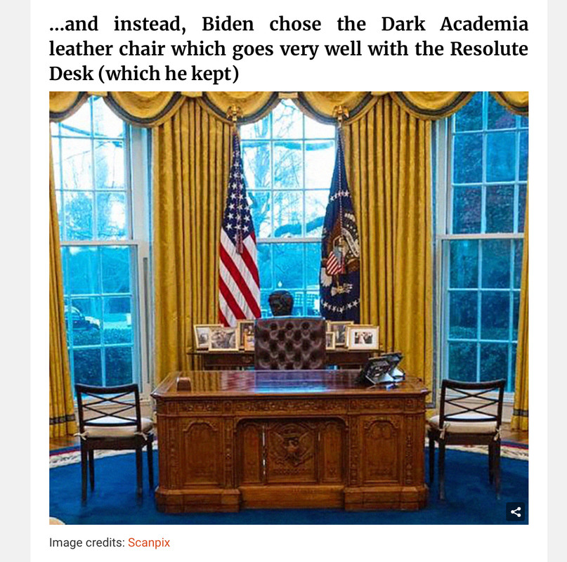I would if I was redoing the oval as president it would be done in subtle rainbows and lots of cat statues scattered about and 2 big stone Sekhmet statues as tall as I am flanking the desk. The Egyptian Gods would be there scattered about the room.Than of course I'd pick the potraits and presidents Biden chose I like who he picked but I would add Jimmy Carter and Obama.
