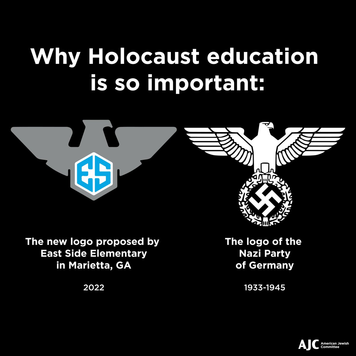 The logo for East Side Elementary in Marietta depicted an eagle, the schools mascot, over the initials ES. The Nazi eagle, which was developed in the 1920s and later became a symbol for white supremacists worldwide, depicts an eagle holding a swastika in its talons.