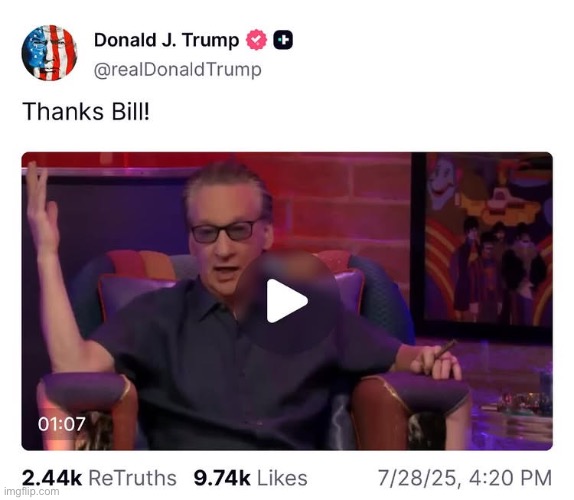 I would have thought and I gotta own it that these tariffs were going to fking sink this economy by this time and they didnt, Maher said.