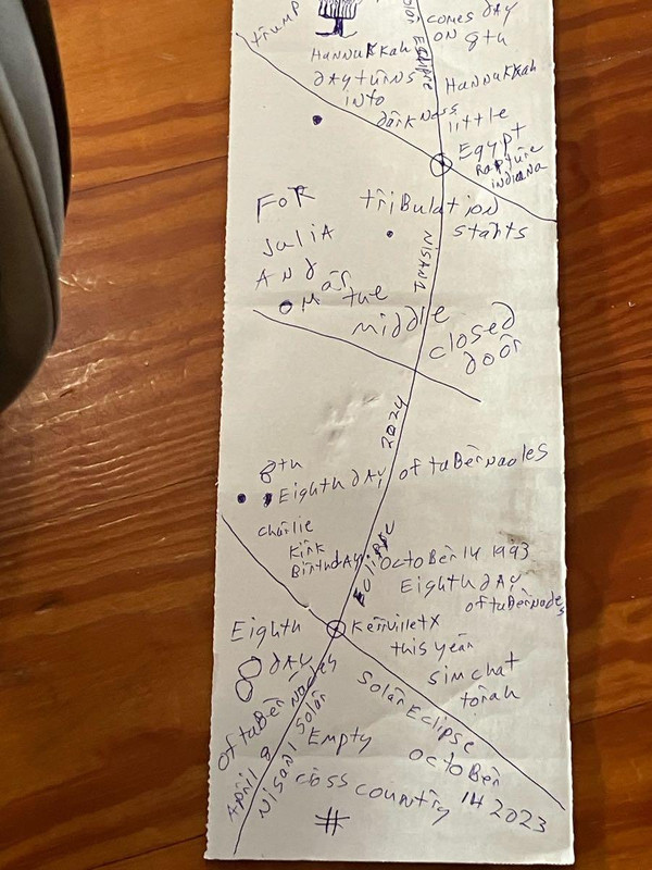 (105,622 posts)Is there anyone Jewish involved? If so, the use of of "the eighth day of Tabernacles", Hannukah, and Nisan is a bit concerning, since there's also Tribulation, the Rapture and Charlie Kirk's birthday mentioned - this is trying to look apocalyptic. Could just be a prank on someone, could be a misplaced missive from a harmless nutter, or it could be meant to worry Julia and Omar, or whoever had the newspaper box.