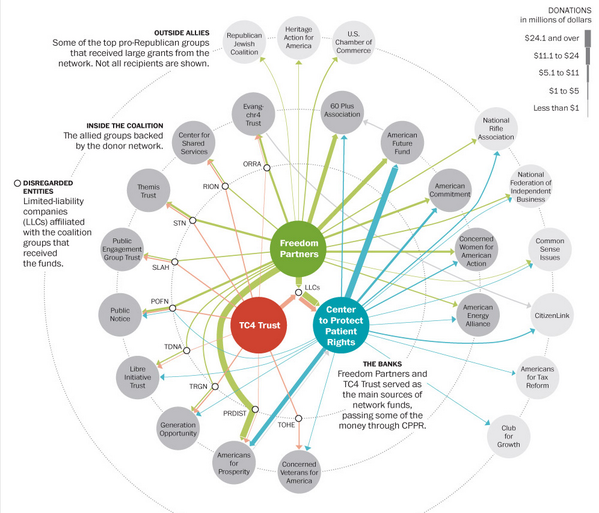 In an analysis of 2011 and 2012 tax filings, The Washington Post and the Center for Responsive Politics found that a coalition of nonprofit groups backed by a donor network organized by the billionaire industrialists Charles and David Koch raised more than $400 million in the last election cycle. Much of the money was distributed to a maze of limited-liability companies affiliated with the nonprofits, which used some of their resources to turn out conservative voters and run ads against President Obama and congressional Democrats.
