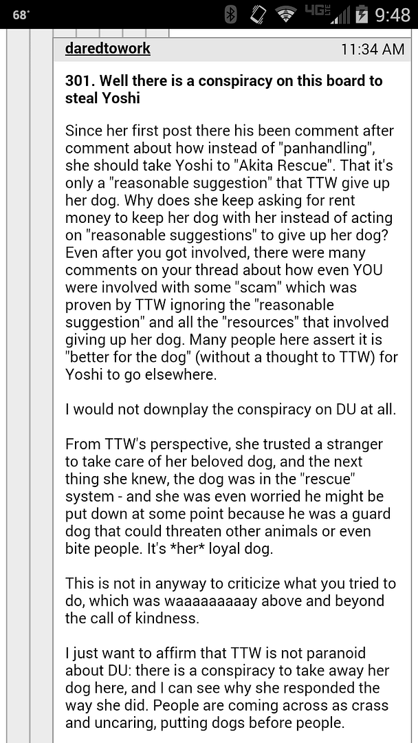 I think that collectively we must all resign ourselves to the fact that there is nothing that anyone can do here. TTW is pretty much unemployable in her mental state, which has probably deteriorated over the years. Yoshi is pretty much un-re-homeable in his current state. Unless TTW has the mental capacity to realize that she has to let go of Yoshi in order to get herself back on track, and recognizes that she needs serious long term medical mental health care AND has the money to even fund such a venture, the outcome, while not specific, is predictable.