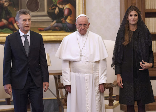 Macri, Pope Francis, and the sweatshop-owning Argentine First Lady, Juliana. Francis was not pleased with Macri's trickle-down IMF policies, and let him know it.[/center]