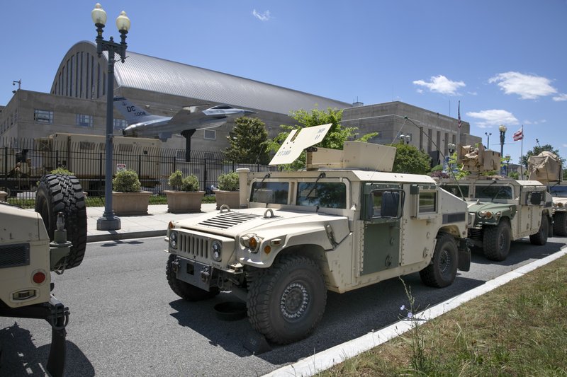 Vehicles for the District of Columbia National Guard are seen outside the D.C. Armory, Monday, June 1, 2020, in Washington. Protests have erupted across the United States to protest the death of Floyd, a black man who was killed in police custody in Minneapolis on May 25. (AP Photo/Jacquelyn Martin)