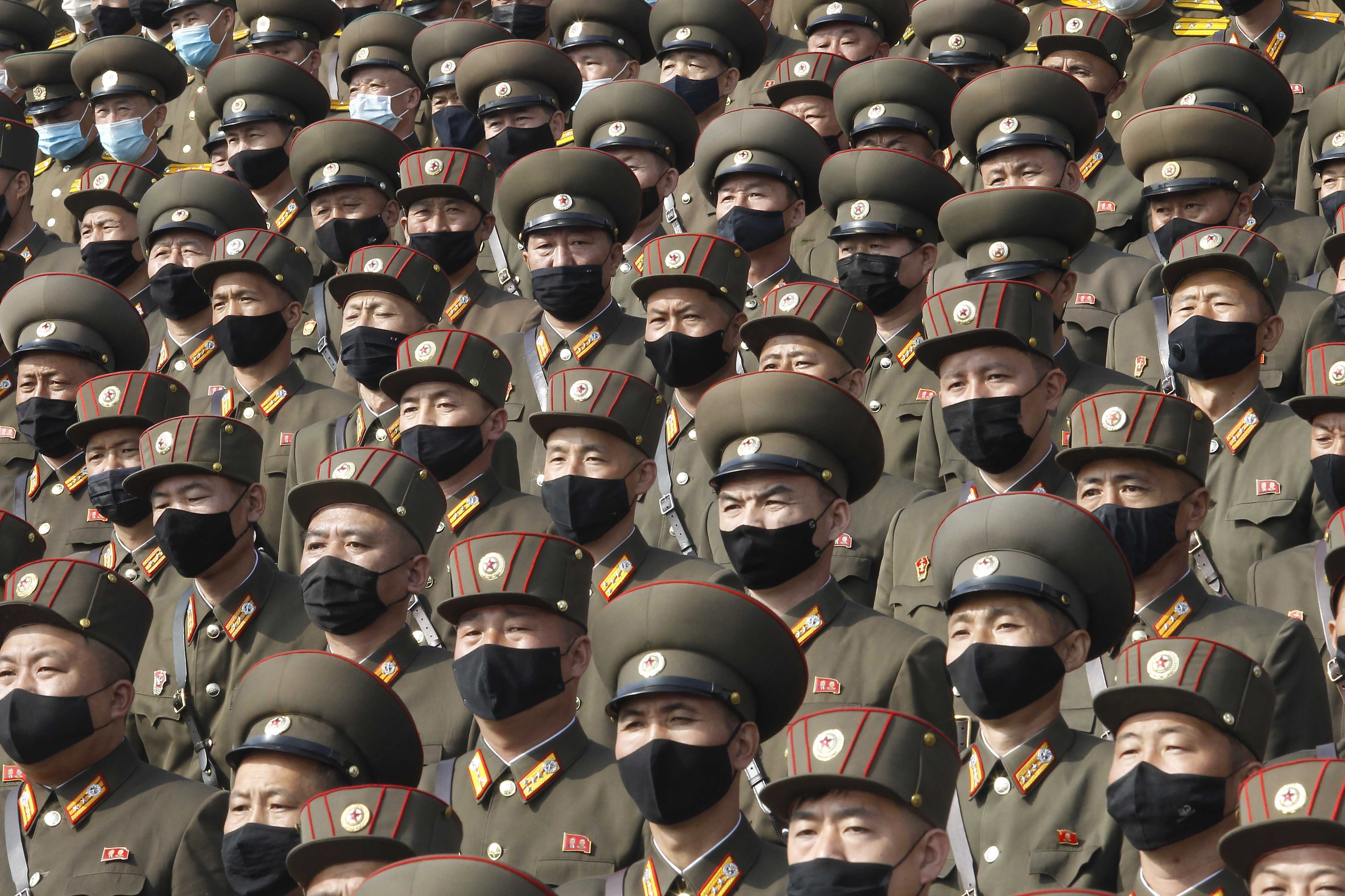 North Korean soldiers stand at a rally in Kim Il Sung Square in Pyongyang on Oct. 12. (Jon Chol Jin/AP)