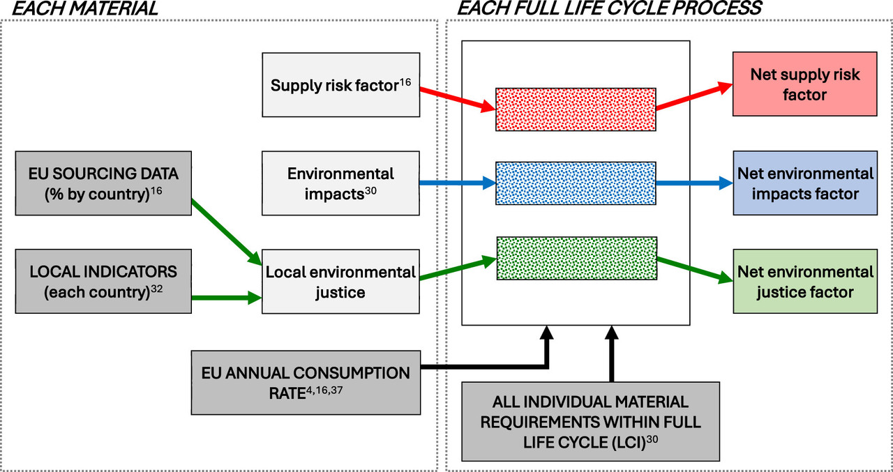 To bridge this gap, we present here a series of methods─developed for assessing energy system characteristics as part of the SENTINEL project (29)─that use raw material inventory information from life cycle assessment (LCA) databases alongside other data sources to generate three unique indicators specifically related to the supply of raw materials. First, the risk of interruption to raw material supply channels is quantified by incorporating supply risk data published by the EC. (16) Two further indicators attempt to quantify the possibility of localized issues occurring during the extraction and processing of raw materials: the potential to exacerbate local environmental conditions is estimated using ecosystem and human health data relating to individual materials from the Ecoinvent LCA database, (30,31) while the potential to reproduce local environmental justice issues is quantified using data relating to sourcing countries within the Worldwide Governance Indicators (WGI) data set. (32,33) Collectively, we believe these three indicators represent the majority of key issues in relation to raw material supply at present...