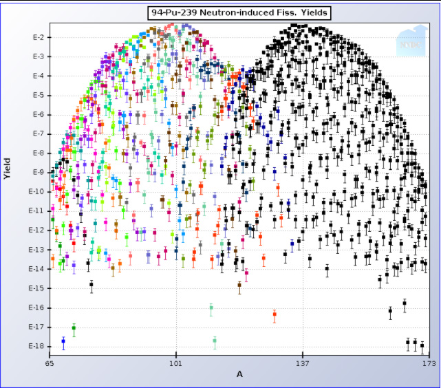 The italicized and bolded term "high yield" is wrong. The yield of 79Se is low compared to other fission products, almost to the point of triviality, which, as I will argue below, is somewhat unfortunate. The stable isotope associated with mass number 79 is 79Br, one of the two stable isotopes of bromine. Below are graphics, from the Brookhaven National Lab (BNL) Nuclear Data pages, showing the distribution of fission products for the two major fission sources found in a commercial light water or heavy water reactor with a mass number abscissa, 235U and 239Pu, the latter generated in situ in operations from neutron capture in the fertile but not critically fissionable isotope 238U.