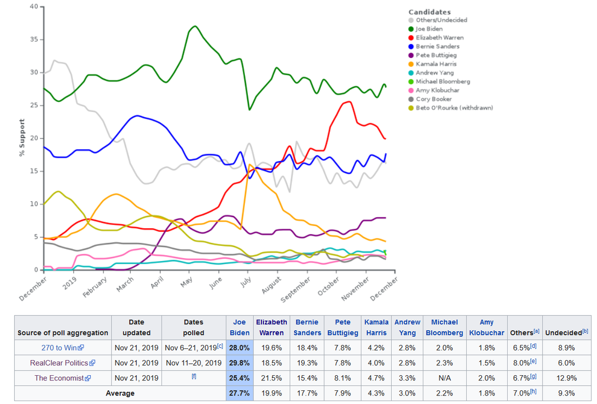 Related: About this forumRCP POLL AVERAGES: Biden 29.8, Sanders 19.3, Warren 18.5 [Biden +10.5]. Also Wikipedia's Aggregate