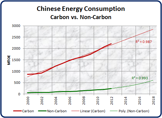 In order to get a feel for that, let's look at China's build-out rate of carbon and non-carbon energy sectors. This graph shows the performance of both sectors over the last 12 years, since their big expansion began. The carbon line includes oil, gas and coal. The non-carbon line aggregates all renewables, hydro and nuclear power. Then the current trends are extrapolated out 6 years, based on these two assumptions of yours: